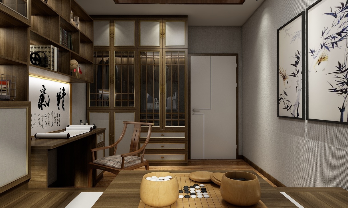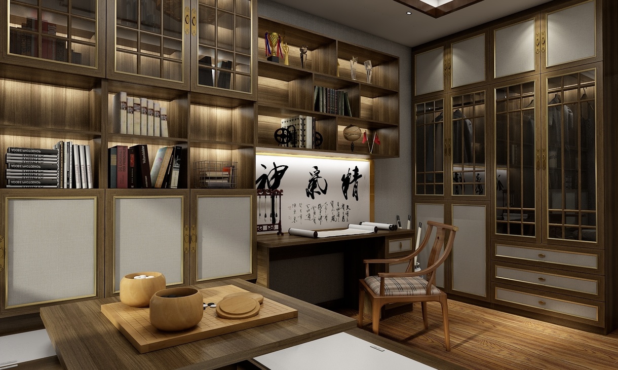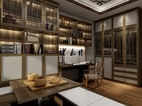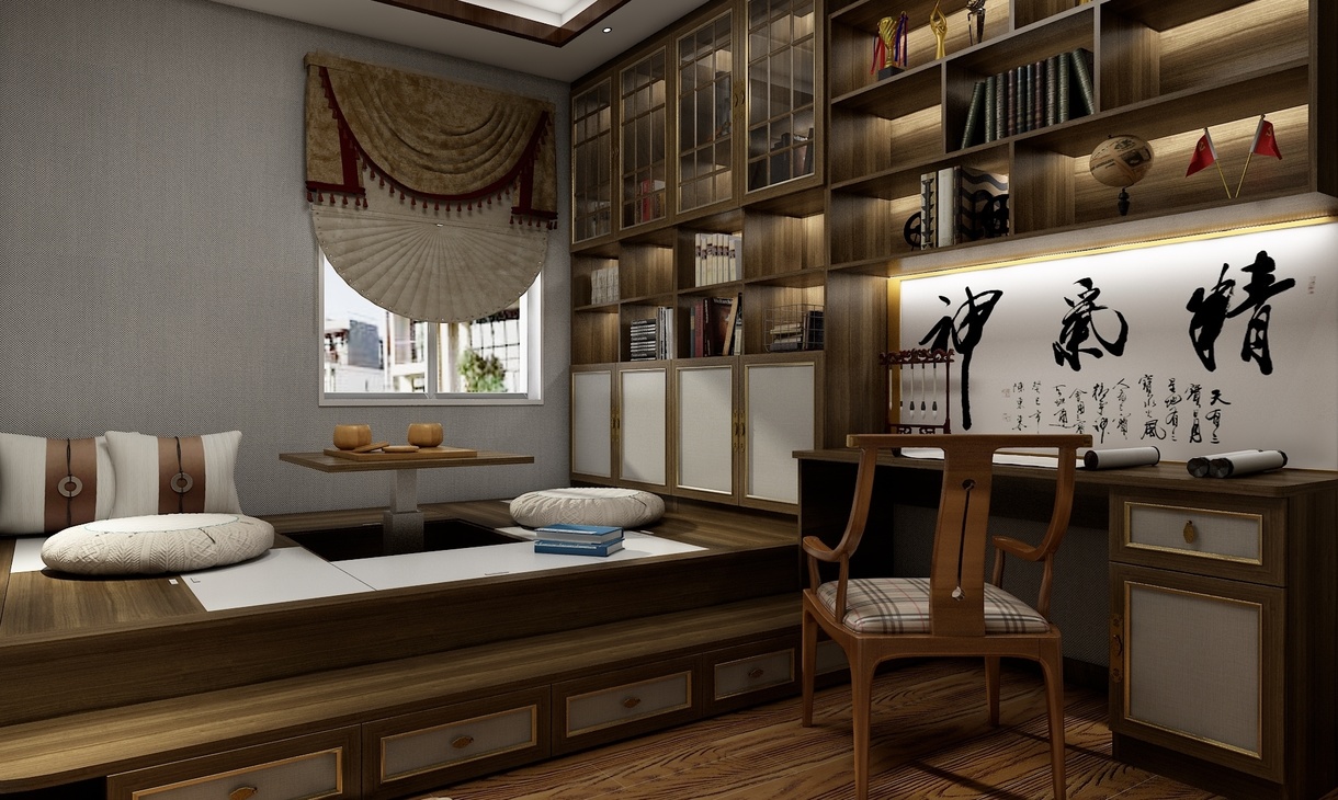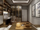 榻榻米多功能房集書房、客房、休閑室、儲物間等多種功能于一體的實用空間。李教授可以與志同道合的友人一起切磋下棋藝,揮灑筆墨紙硯,一起品賞中國山水等文化;可以作為客房,供子女偶爾回來居住;李教授是一位文學愛好者,收藏了很多國內外文學作品,故在榻榻米邊設計一書柜,李教授非常的滿意;兩老懷舊感都很強,家里存了很多有意義,有年代的物品,所以榻榻米強大的收藏功能得以體現價值。整體木色密蘇里胡桃,金屬分格邊框門,山水掛畫,使得整個空間散發出濃濃的新中式生活氣息