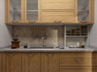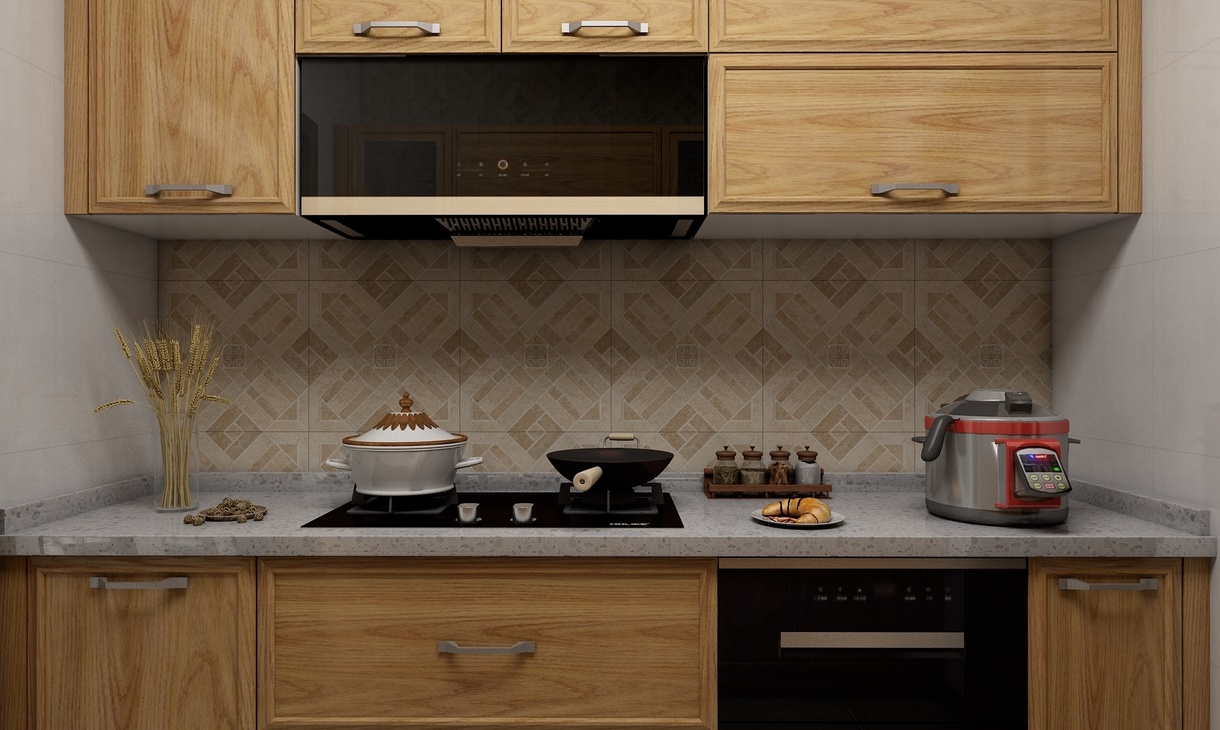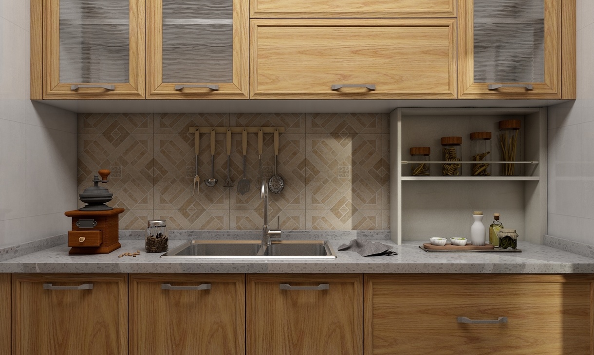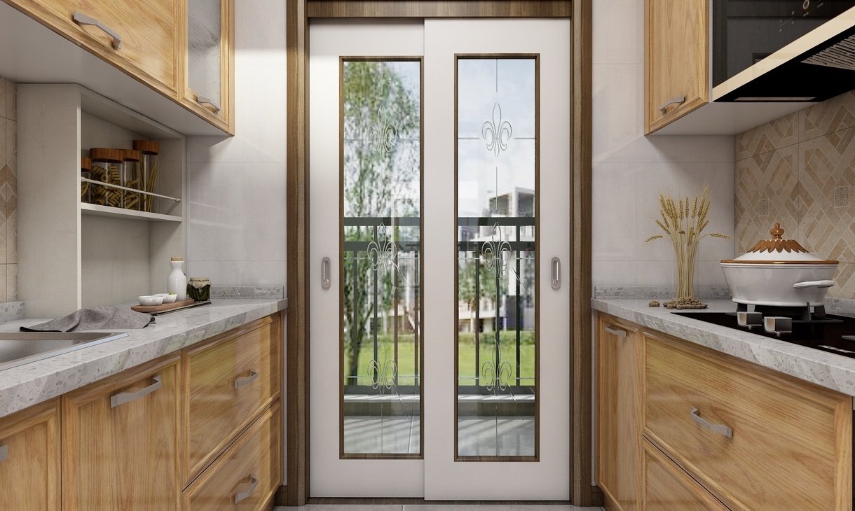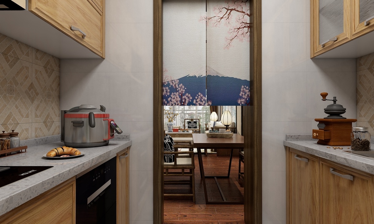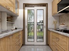 廚房連通餐廳與盥洗陽臺,廚柜設計為雙一字型,把廚房功能區分為兩部分,一部分是清洗處理材料,一部分是烹飪和擺放;完美的動線設計,讓烹飪更舒適,老伴在下廚時,省心又省力。金色線條吸油煙機與黃橡造型門板優美結合,使人保持舒適而豁達