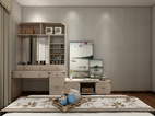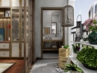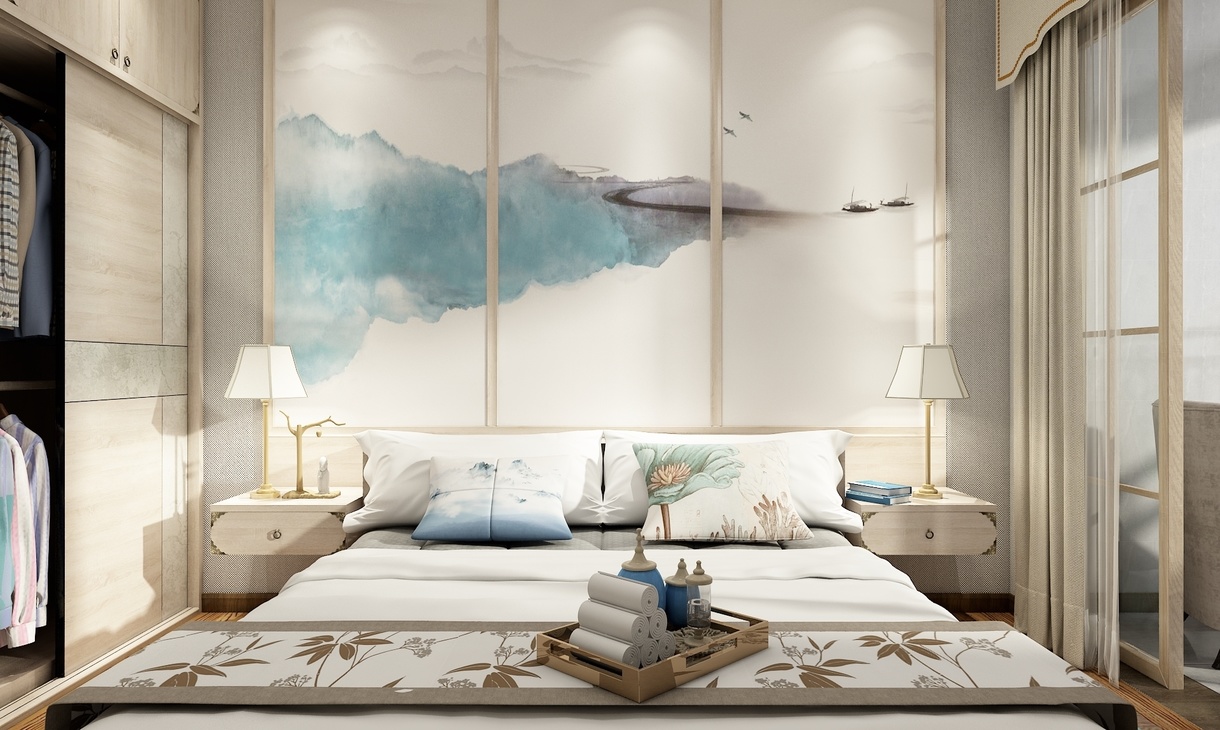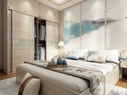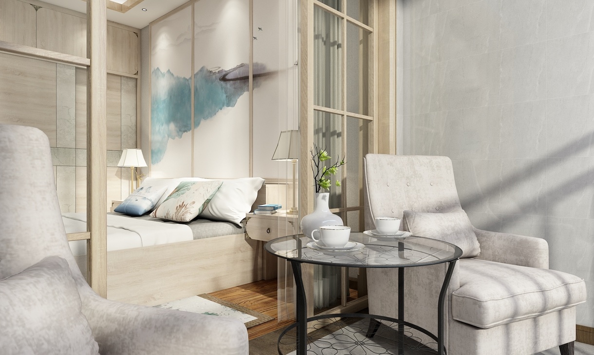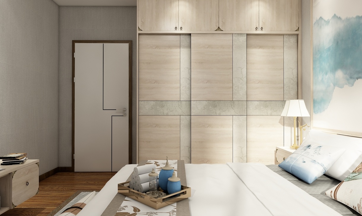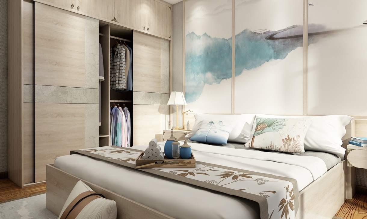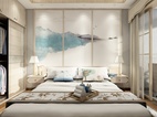 早來的黎明,透過迷霧的光陰,映在貝加爾灰橡上,讓整個空間清朗,年輕的氣息在游走、停歇。靜止的老時光,衣柜移門水泥質感及紋路撞色,入眼即是變遷與冷靜,伴隨歲月的洗禮,點綴臥室的藝術與雅致。歲月清洗下的質感,青古銅護角和拉手表面雕刻紋 樣,配以擦色工藝,營造古樸中式韻味,散發著凝重深沉的氣質,包攬滄桑,回味間徜徉古往今來。3D打印的山水畫背景墻,優雅的藍色、還有純潔的白色,使整個空間看起來更有生機,使人感到靜謐