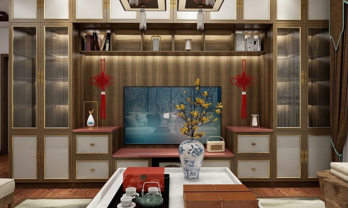 電視柜與餐廳柜利用了傳統中式風格運用的明式家具手法,平直對稱 、收分合理 、天圓地方等理念 ;比例勻稱,尺度適宜,穩重挺拔,收分有致;以線為主,線型豐富。整體密蘇里胡桃花色,崢嶸磨礪出的沉著與穩重,風雨澆灌下的厚重;金色線條邊框門,配以淺布紋門芯撞色,現代金屬流線感強。采用木質地板,減少瓷磚所帶來的滑度,增添新中式生活氣息