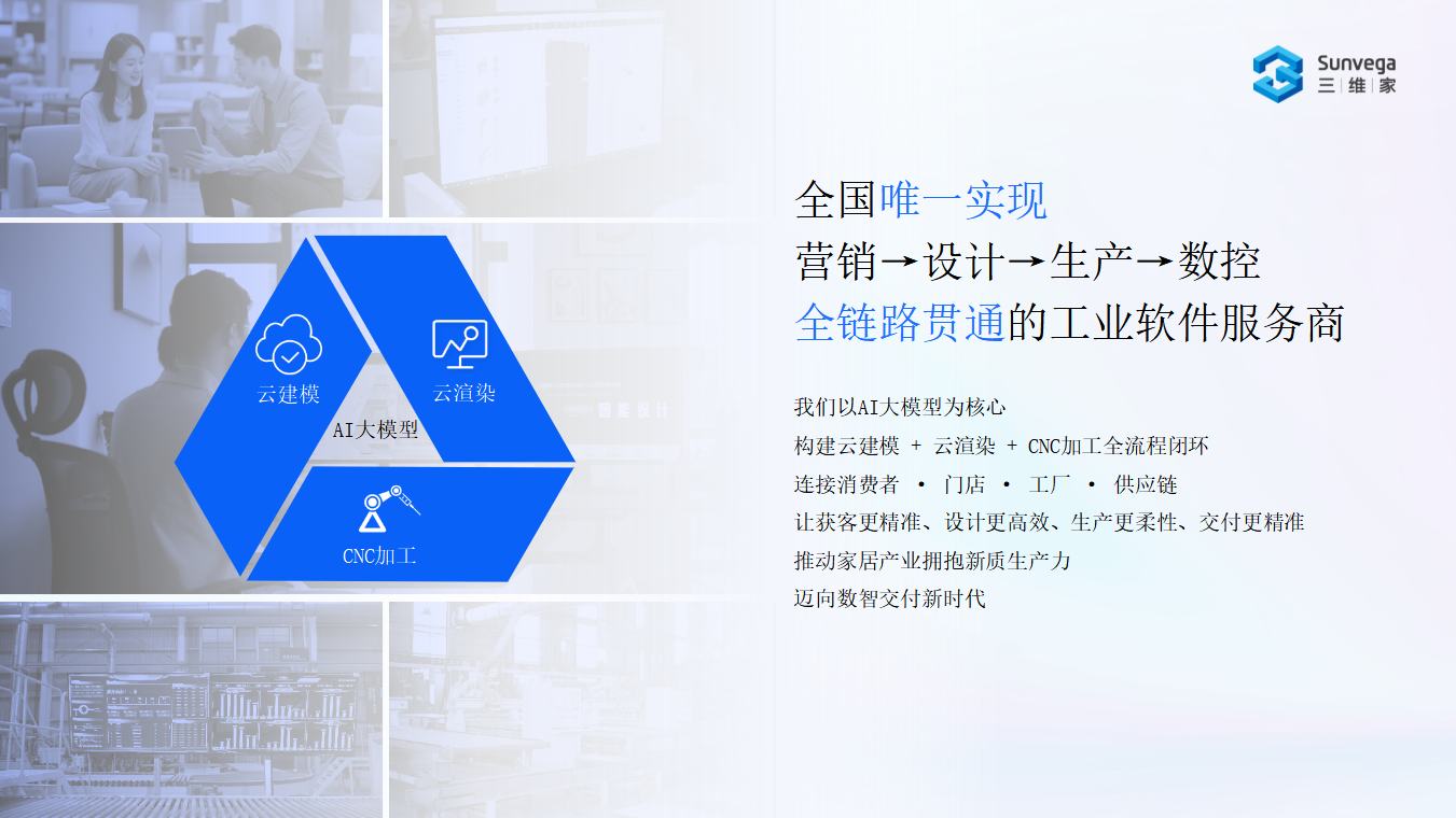 三維家成立于2013年,是國內家居產業數字化領域的標桿企業,以AI大模型為核心驅動力,依托云建模、云渲染、CNC加工三大自研核心引擎,構建了“營銷?設計?生產?數控”全鏈路貫通的數字化服務體系,成為全國唯一實現該全流程閉環的工業軟件服務商。公司秉持“所見即所得”核心理念,聚焦定制家居、智能家居、整裝公司等多類客戶群體,提供覆蓋全產業鏈的數字化解決方案,助力行業降本增效、縮短交付周期,推動家居產業向數智交付新時代轉型。