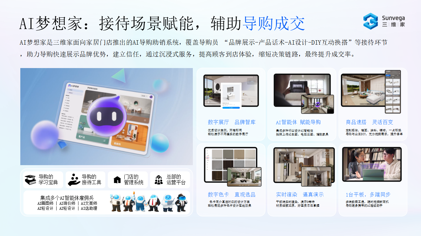 AI 夢(mèng)想家是三維家專為家居門店打造的AI 導(dǎo)購(gòu)助銷系統(tǒng),核心定位是通過集成 “品牌展示、智能設(shè)計(jì)、互動(dòng)體驗(yàn)、話術(shù)支持” 等全流程接待能力,賦能導(dǎo)購(gòu)員高效服務(wù)客戶,縮短決策鏈路,提升門店成交率,是三維家營(yíng)銷獲客體系中聚焦 “門店現(xiàn)場(chǎng)轉(zhuǎn)化” 的核心產(chǎn)品。
