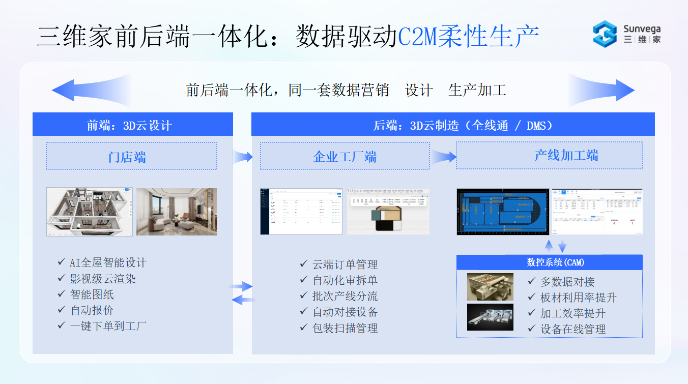 三維家前后端一體化是基于 “數據同源” 核心的 C2M 柔性生產解決方案,作為公司生產制造環節的核心產品,深度融入 “AI+C2M 全鏈路數字化” 體系,打通 “營銷 - 設計 - 生產 - 數控” 的關鍵數據通路,實現前端 3D 云設計方案與后端生產加工數據的無縫銜接,無需人工重復錄入或調整,以 “同一套數據貫穿全流程” 為核心優勢,適配中大型企業(KA)與中小微企業(SMB)不同規模的生產需求,助力家居企業解決設計與生產脫節、效率低、出錯率高的行業痛點。